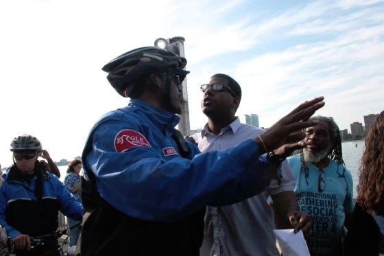 Private security guards attempting to remove demonstrators for water rights from the Detroit RiverWalk, a public space managed by Detroit … More